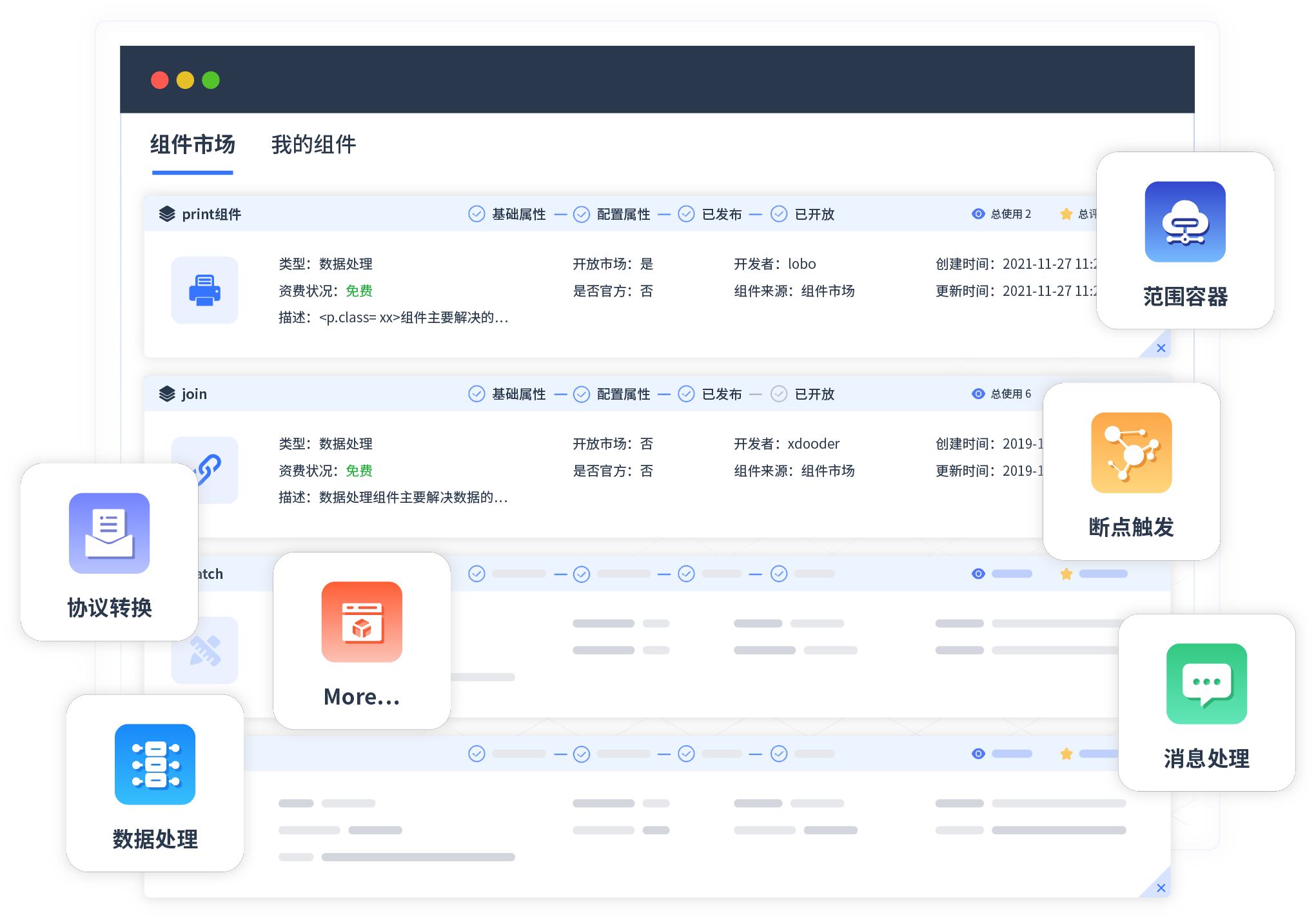 针对集成场景,,,,圆梦钱包提供组件市场,,,例如协议转换、、、、消息处理、、、、文件操作等。。。。除平台提供的组件外,,客户可以自定义所需组件。。