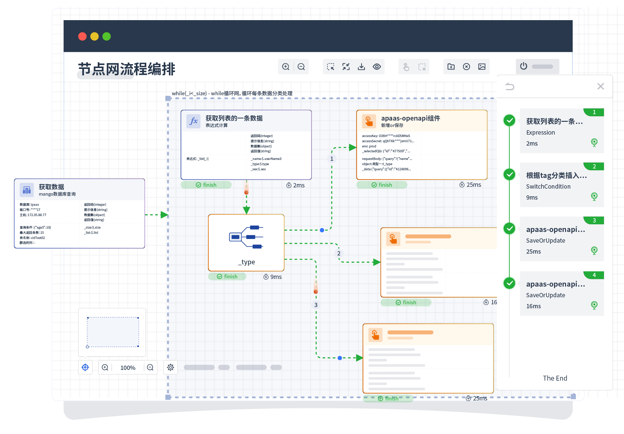 针对集成场景,,组件定义后支持进行流程编制,,,不同于传统代码方式,,通过图形化展示,,,支持在线调试、、、、日志查看和运行回放。。