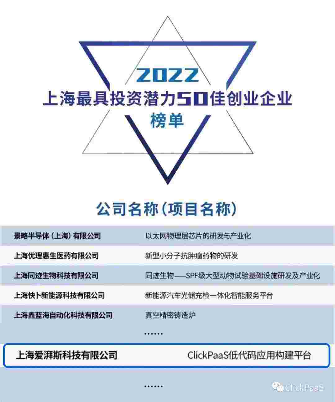 圆梦钱包 作为国内低代码PaaS平台的领军企业,,与120家创企入围角逐。。。。期间接受了来自德同资本、、、、领中资本等知名投资机构的10位投资人组成专家评委团的背靠背盲选。。。并最终入围“2022上海最具投资潜力50佳创业企业”榜单,,被列入“上海市重点培育创业企业库”。。。