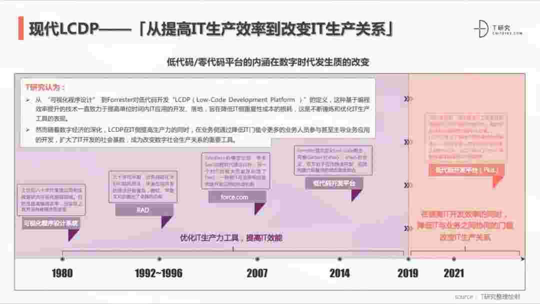 2020年前后,,源于提高IT工作者开发效能的LCDP不断进化和衍生,,面对业务导向日益明显的数字化变革。。。LCDP衍生出了面向不同对象的升级服务——面向专业人群的LCDP和业务人群的NCDP,,,LCDP与NCDP的不同服务属性被逐渐认可和接受。。。。 LCDP在提高IT开发效率的同时,,,,降低IT与业务之间协同的门槛改变IT生产关系。。