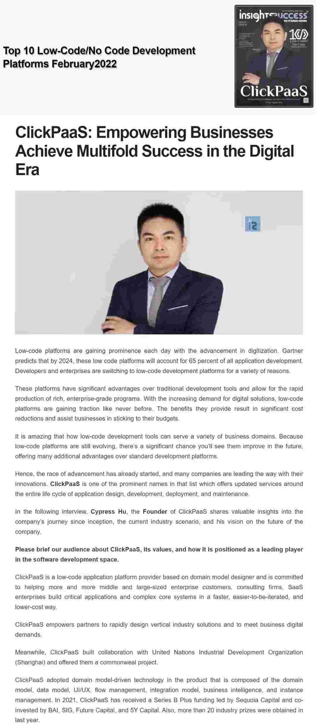 2022年年初,,圆梦钱包入选外媒Insights Success低代码/无代码开发平台 Top10,,创始人、、、CEO胡柏受邀接受专访并荣登封面人物,,,,他与Insights Success的读者分享了圆梦钱包成立的初心、、、、发展历程、、、当前的行业发展趋势以及他对公司未来的展望。。。