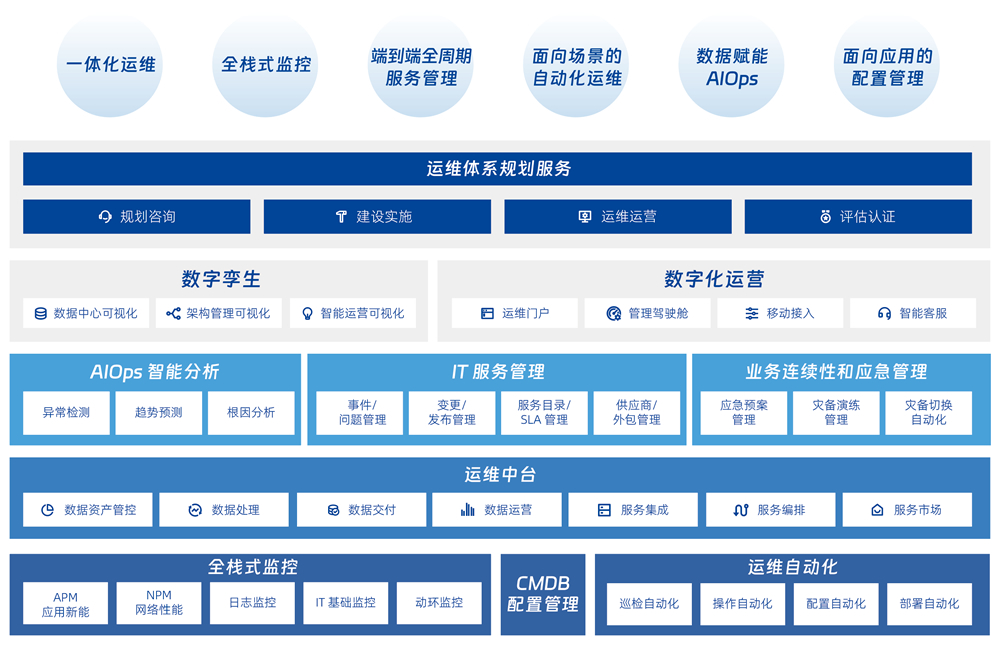 针对数字化时代对运维管理的需求,,,自主研发的“监管控析”一体化智能运维解决方案。。。平台以客户和业务场景为导向,,通过全业务的数据和流程整合,,,,同时支持传统 IT 架构和云技术架构的“双态 IT”运维,,实现可视化、、、场景化、、自动化、、、、精细化的智能运营管理,,,,提升用户体验及运营效率,,助力内外部生态的数字协同和价值创造。。。